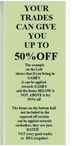 they work in a Ladder scale, meaning you can apply the item towards itself and everything below it, but not above it. The reasons for this are because each one is slightly more difficult to get in than the one below it and also to keep that item in stock. Otherwise someone could bring in Magazines and wipe out our stock of DVD’s, it’s basically to keep things fair, that way if you bring Games in we’ve got Games for you to choose from.